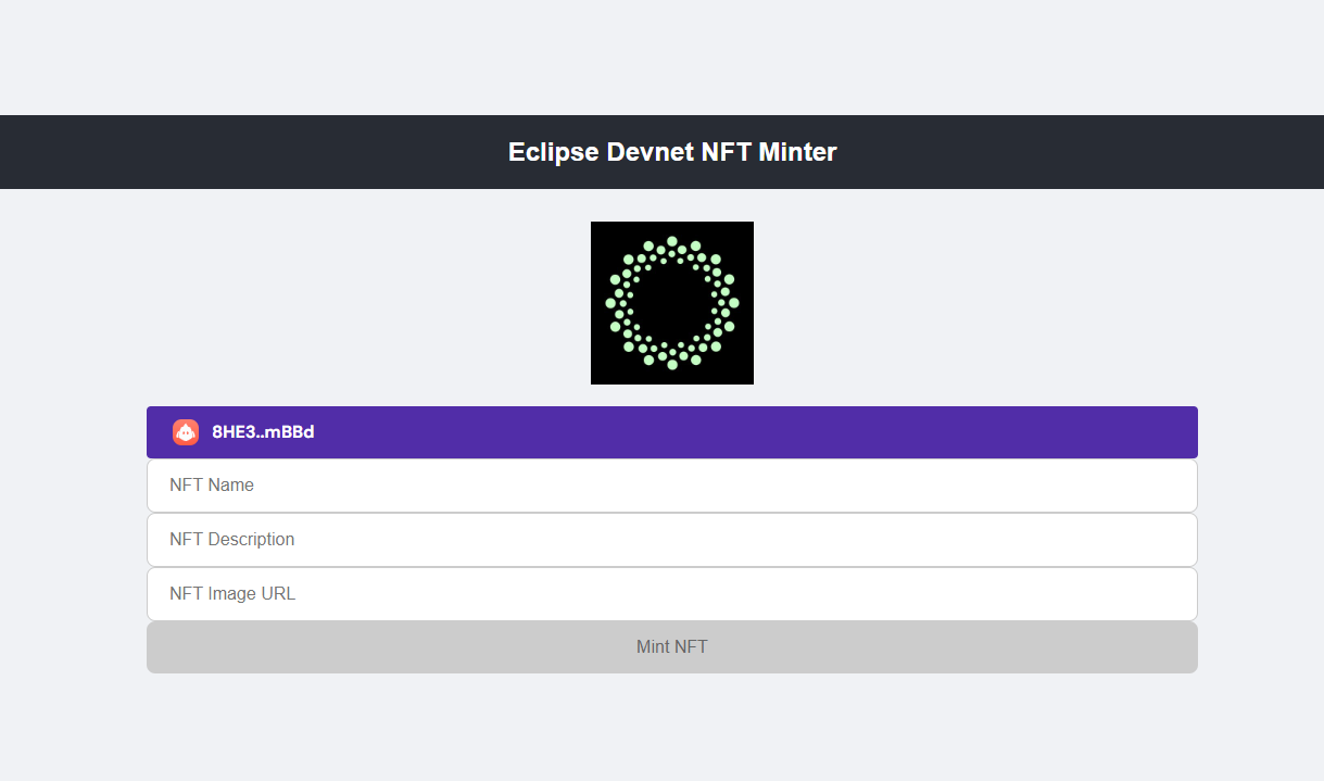 <button onClick={onMintNFT} disabled={!wallet.connected || !nftName || !nftDescription || !nftImageUrl}>