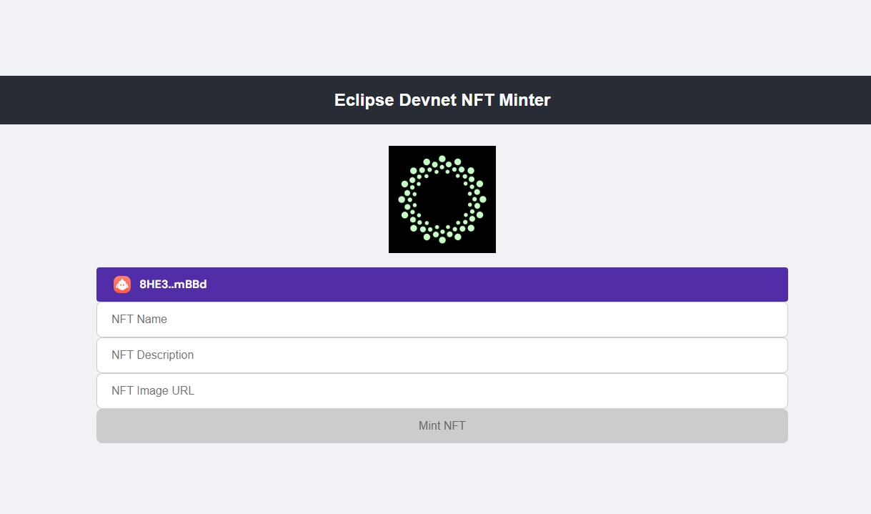 with detailed functionalities such as wallet connection, input fields for NFT attributes, and minting actions, follow the provided code and instructions closely. This comprehensive setup will enable users to mint NFTs on the Eclipse Devnet directly from the UI.
