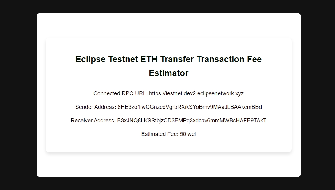 By following these steps, you can confirm the effectiveness of the estimator in predicting the transaction fees for ETH transfers on the Eclipse Testnet. This method provides a practical way to gauge the estimator's performance in real-world conditions.